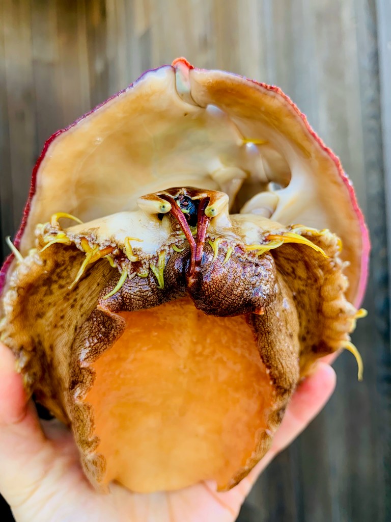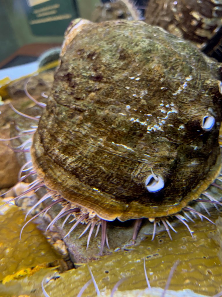 The top of an abalone shell contains a row of holes, called respiratory pores. Abalone use these holes to breath (their gills are located just underneath the pores), to excrete waste, and to expel eggs and sperm. They have a mouth at the anterior end, just behind their adorable eyes. White abalone are herbivores, preferring to eat algae including the iconic giant kelp. They get their name from the color of their mantle (or soft tissue) that peaks out through those holes, which looks white, even at depth. Their foot tissue and epipodia (the frilly bits along their sides) range from bright orange to beige.