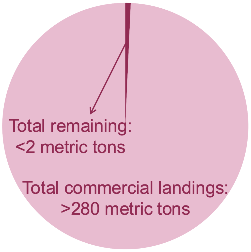 White abalone is considered Endangered throughout its range. Commercial fishing removed over 280 metric tons of white abalone from the ocean. Less than 2 metric tons (approximately 1,600-2,500 animals) remained. By the time the commercial fishery closed in 1997, the damage had been done, and over 99% of the species was lost in just one decade. Abalone are broadcast spawners, which means that males and females release sperm and eggs into the water column, where they will join together and form an embryo. For this to happen, abalone need to be near another white abalone of the opposite sex. Otherwise, the gametes would be too dilute to lead to successful fertilization.